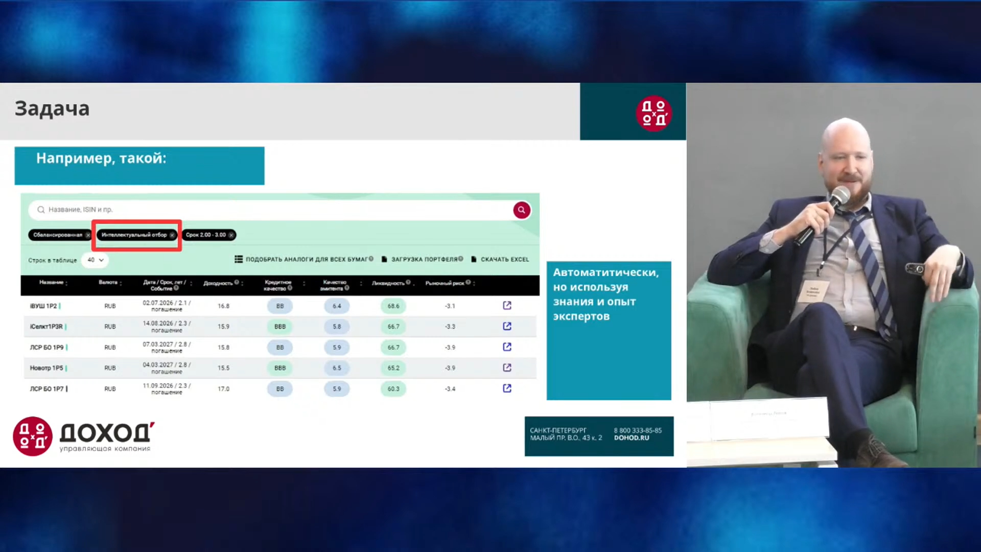 Всеволод Лобов, директор по инвестициям УК «ДОХОДЪ», стал участником дискуссии «Разработка и обоснование инвестиционных стратегий», посвятив свое выступление теме интеллектуального отбора облигаций, реализованного в функции iBond онлайн-сервиса «Анализ облигаций».